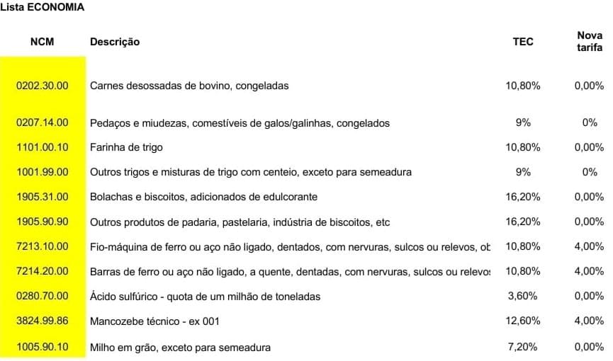 Confira a tabela com os produtos contemplados pela redução do Imposto de Importação: